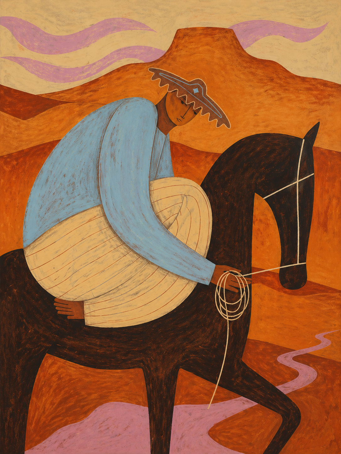 Стильный постер в стиле фолк-арт с изображением ковбоя верхом на чёрной лошади на фоне оранжевой пустыни и гор. Тёплая палитра, контрастные линии и детальная графика создают уникальную атмосферу приключений. Идеален для комнаты в стиле вестерн или бохо.