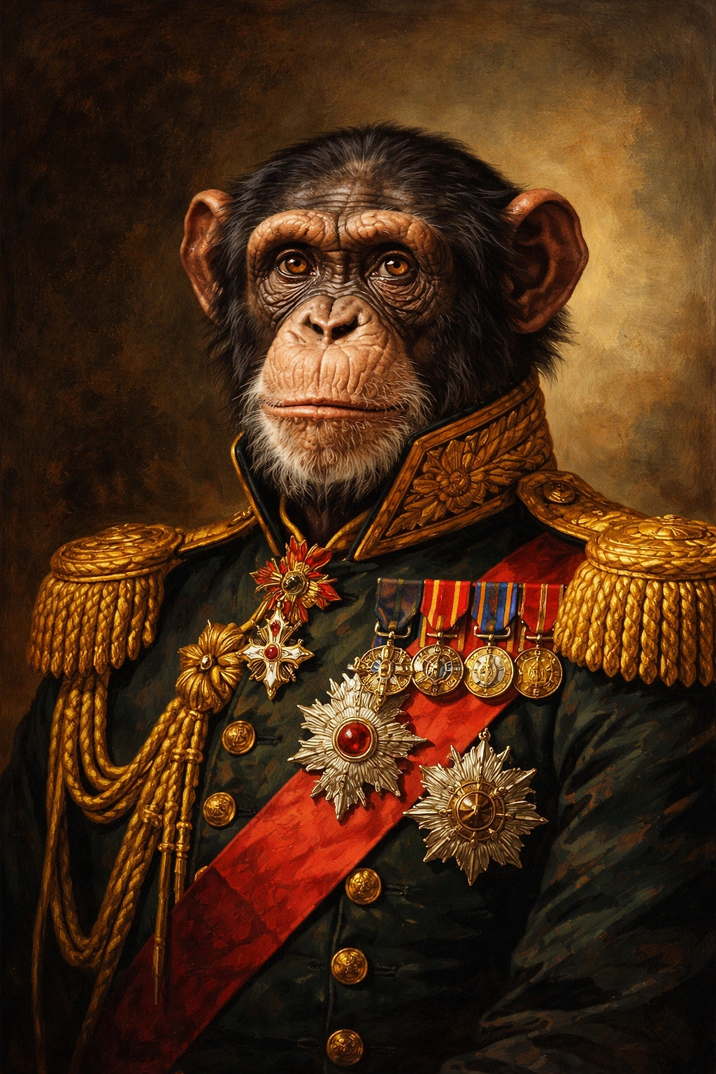Эффектный постер с портретом шимпанзе в роскошном военном мундире, выполненный в стиле классической живописи. Детализированная проработка, глубокие тёплые оттенки и выразительный взгляд создают атмосферу аристократического портрета с лёгкой долей иронии. Идеально подойдёт для современного интерьера, кабинета или креативного пространства — добавит характер, юмор и визуальный акцент. Отличный выбор для тех, кто ценит необычное искусство и стильные детали.